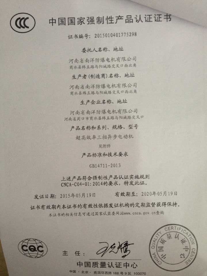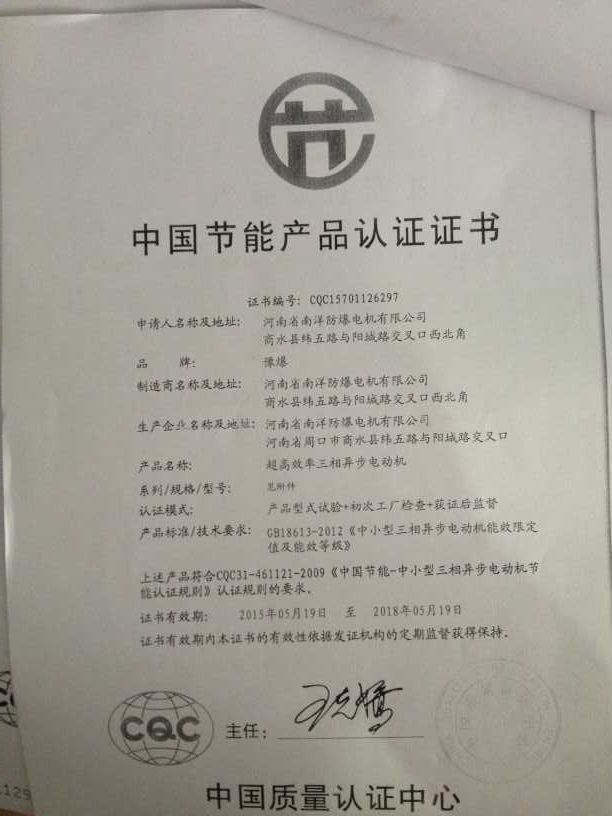 在2015年5月19日的這一天,對(duì)于河南省南洋防爆電機(jī)有限公司來說是值得慶祝的一天。因?yàn)榫驮谶@一天公司獲得了YE3系列超高效率隔爆型電動(dòng)機(jī)的雙重產(chǎn)品認(rèn)證證書。也就是說在這一天河南省南洋防爆電機(jī)有限公司可以投入YE3超高效率隔爆型電動(dòng)機(jī)的生產(chǎn)了。至此普天同慶的時(shí)刻,河南省南洋防爆電機(jī)有限公司董事長王科偉先生代表公司對(duì)做出這一貢獻(xiàn)的廣大同仁表示慰問和感謝。