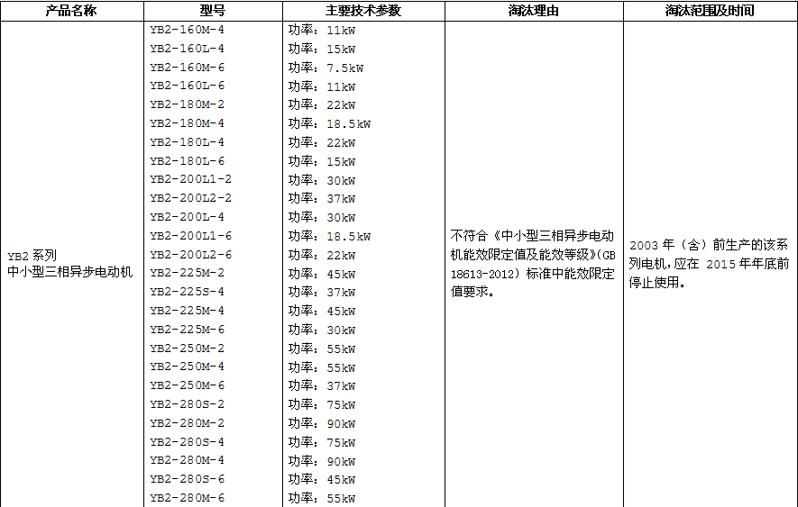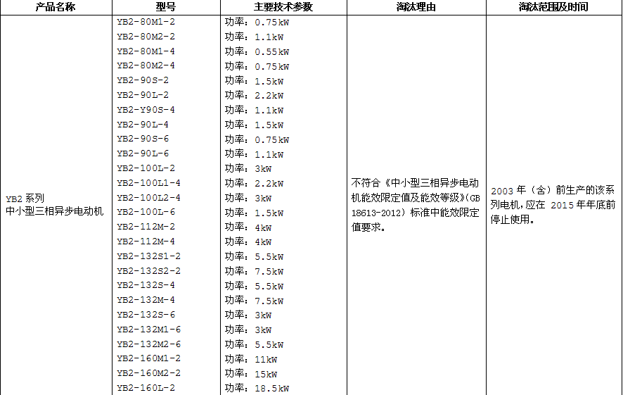 在網(wǎng)上很多用戶都在搜YB2系列防爆電機(jī)將在什么時(shí)候淘汰,淘汰的范圍和時(shí)間是什么。今天南洋防爆電機(jī)有限公司給大家說一下YB2系列防爆電機(jī)將被淘汰的范圍和時(shí)間。大家請(qǐng)看下圖: