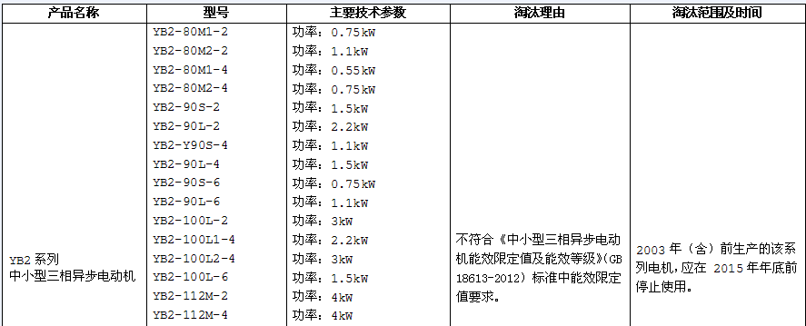 在上圖之中大家看到在淘汰范圍及時間里面有這么一句“2003年(含)前生產(chǎn)的該系列電機(jī),應(yīng)在2015年年底前停止使用”。這樣就規(guī)定了在2003年之后生產(chǎn)的機(jī)器還可以使用。也請大家放心使用。