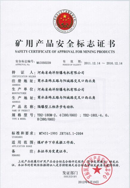 下面是YB2-180L-4-22KW防爆電機(jī)的防爆合格證和煤安證,有了這兩種證明,就可以證明YB2防爆電機(jī)繼續(xù)可以為煤礦服務(wù)了。