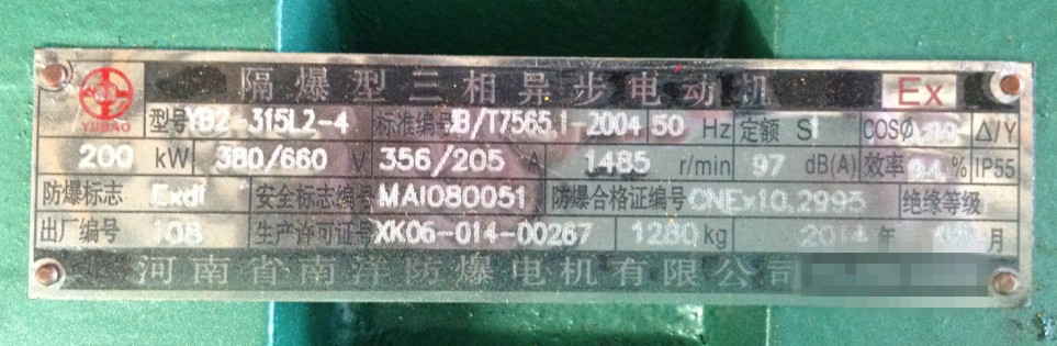 上面羅列的YB2系列防爆電機(jī)的型號315L2-4,功率200KW,電壓380/660V,電流356/205A,轉(zhuǎn)速1485r/min,效率94%,防護(hù)等級IP55,防爆標(biāo)志EXDI,絕緣等級F,重量1280KG,生產(chǎn)日期2014年9月,頻率50Hz等等。在上面都可以找到。而標(biāo)準(zhǔn)編號表示的是YB2系列防爆電機(jī)一定要符合這個標(biāo)準(zhǔn)才算是合格產(chǎn)品,最重要的就是上面的安全標(biāo)志編號、防爆合格證編號和生產(chǎn)許可證號一定要與給到咱們的各種證件上面一一對應(yīng)。要是對不上一定要通知廠家要求重新發(fā)貨。