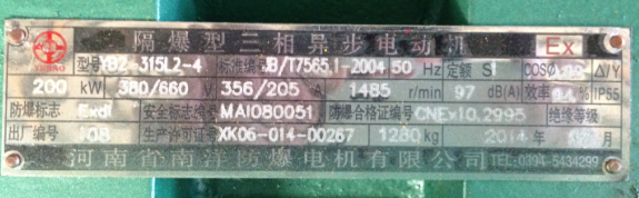 今天上午有個客戶打來電話詢問是否有YB2系列4P200KW防爆電機的現(xiàn)貨,我說有的。然后我就把YB2系列4P200KW防爆電機的銘牌給客戶發(fā)過去了。然后客戶需要回去商量一下,下面為大家列出YB2系列4P200KW防爆電機的銘牌。如果大家有需要購買YB2系列防爆電機,可以和我們河南省南洋防爆電機生產(chǎn)廠家聯(lián)系,我們會為您竭誠服務(wù)的。